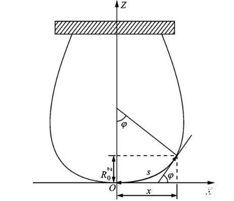 懸滴法利用測定處于重力與表面張力平衡狀態(tài)的液滴外形,獲得待測液體的表面張力。懸滴外形的幾何關(guān)系如圖1所示,在考慮液體靜壓作用的基礎(chǔ)上,由經(jīng)典Young-Laplace方程推導(dǎo)得歸一化Bashforth-Adams工作方程為,式中:σ為表面張力;φ表示外形輪廓線某點(diǎn)切線與橫坐標(biāo)夾角;s為弧長;R0為頂點(diǎn)曲率半徑;ρl、ρg分別表示液相和氣相密度;g代表當(dāng)?shù)刂亓铀俣龋疚娜?.7965 m·s-2。