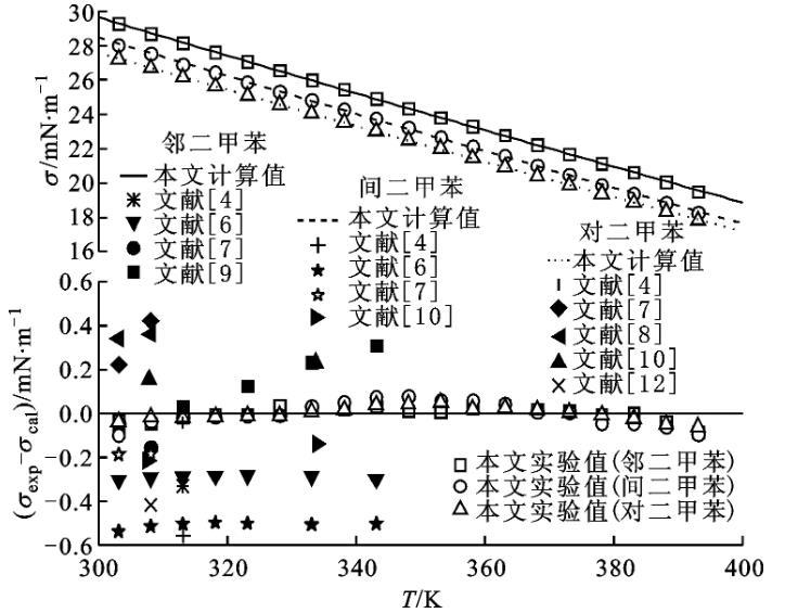 圖4鄰二甲苯、間二甲苯和對(duì)二甲苯表面張力與溫度關(guān)系以及與方程計(jì)算值和文獻(xiàn)值比較