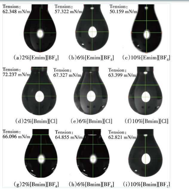 1)表面張力測(cè)試。在室溫為25℃的環(huán)境中,利用電子天平將[Emim][BF4]、[Bmim][Cl]、[Bmim][BF4]分別配制質(zhì)量分?jǐn)?shù)為0.6%、0.7%、0.8%、0.9%、1%、2%、3%、4%、5%、6%、7%、8%、9%、10%的活性水溶液,測(cè)定不同質(zhì)量分?jǐn)?shù)下離子液體溶液的表面張力3次,取平均值。