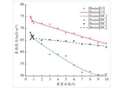 2)在離子液體質(zhì)量分?jǐn)?shù)繼續(xù)增大到一定階段后,表面張力逐漸趨于穩(wěn)定。這是由于當(dāng)質(zhì)量分?jǐn)?shù)繼續(xù)增大到一定值時(shí),陰陽(yáng)離子形成膠束,此時(shí)質(zhì)量分?jǐn)?shù)增大對(duì)表面張力的影響較小。分析得出3種離子液體單一溶液對(duì)降低表面張力的能力大小為[Emim][BF4]>[Bmim][BF4]>[Bmim][Cl]。