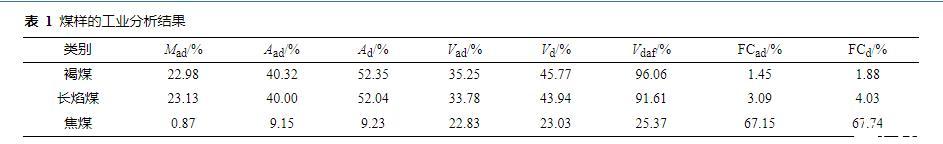 選取不同變質(zhì)程度的褐煤、焦煤及長(zhǎng)焰煤,將煤樣放入球磨機(jī)中粉碎,并通過(guò)篩網(wǎng)過(guò)濾出粒徑在0.074 mm(200目)以上的煤粉,置于45℃真空干燥箱中干燥24 h后放入密封袋中低溫、避光保存。利用全自動(dòng)工業(yè)分析測(cè)定儀對(duì)3種煤樣的水分、灰分和揮發(fā)分進(jìn)行測(cè)定,計(jì)算固定碳,其工業(yè)分析結(jié)果如表1所示。