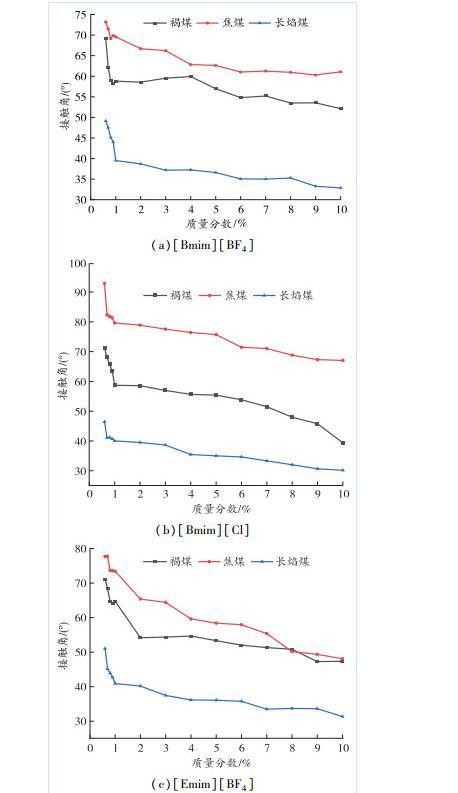 2)當(dāng)質(zhì)量分?jǐn)?shù)達(dá)到某個(gè)特定值之后,離子液體中的官能團(tuán)與煤中基團(tuán)達(dá)到穩(wěn)定結(jié)構(gòu),溶液接觸角的變化開(kāi)始減緩。將3種煤樣的接觸角進(jìn)行對(duì)比發(fā)現(xiàn),長(zhǎng)焰煤和褐煤的親水能力大于焦煤,這可能與煤中親水基團(tuán)和疏水基團(tuán)的含量有關(guān)?;钚运芤涸陔x子液體質(zhì)量分?jǐn)?shù)相同時(shí)接觸角大小排序?yàn)閇Emim][BF4]>[Bmim][BF4]>[Bmim][Cl]。