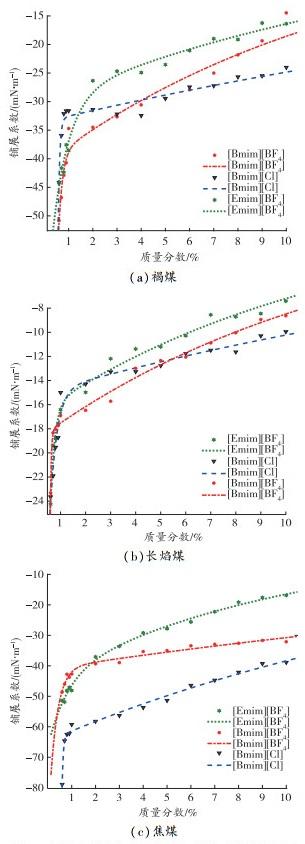 2)3種咪唑類離子液體的鋪展系數(shù)隨離子液體質(zhì)量分數(shù)的增大而迅速增大,長焰煤的親水能力最好,而焦煤的親水能力最差,這與煤中親水基團和疏水基團的含量有關;