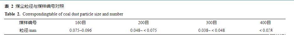 將EMI原液稀釋至質(zhì)量分?jǐn)?shù)分別為0.1%、0.2%、0.4%、0.6%、0.8%、1.0%、2.0%、4.0%、6.0%、8.0%的混合溶液。實驗煤樣選取黃陵一號煤礦弱黏煤樣,煤樣工業(yè)分析結(jié)果見表1。在制備煤塵樣品時,根據(jù)有關(guān)文獻對黃陵一號煤礦綜采工作面煤塵粒徑分布進行檢測,并結(jié)合國際標(biāo)準(zhǔn)化組織對粉塵粒徑的定義,以及實驗室制備條件,去除煤塊外表皮,使用破碎機對煤心破碎60 s,用160、200、300、400目標(biāo)準(zhǔn)工業(yè)篩對煤粉進行篩分,共篩分出0.075~0.096、0.048~<0.075、0.038~<0.048、<0.038 mm共4個粒度范圍的樣品進行實驗,其中煤塵粒徑與煤樣編號見表2。煤樣制備完成后,將其放入80℃的真空干燥箱,真空干燥8 h后密封保存以備實驗使用。