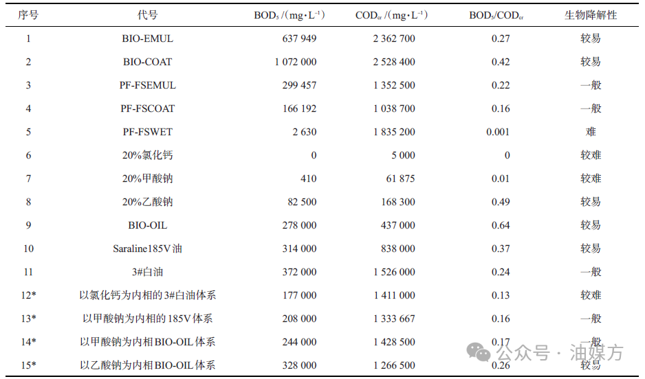 表1降解性數(shù)據(jù)注:標*的樣品配方為:240 mL基液+20 g/L BIO-EMUL+15 g/L BIO-COAT+60 mL內相鹽溶液。
