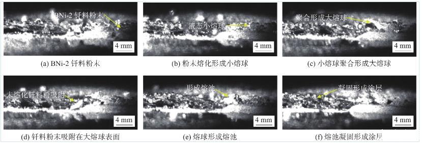 圖3是激光釬涂過程中的超高速攝影照片(4000幅/s),直觀地表征了激光釬涂過程中釬料粉末在激光作用下熔化、鋪展、凝固的過程。從圖3中可看出,在激光釬涂過程中,釬料呈現(xiàn)4種狀態(tài),分別為粉末態(tài)、熔球態(tài)、熔池態(tài)、凝固態(tài)。在激光未掃描的位置,釬料保持原始的粉末狀態(tài),如圖3a所示。被激光束掃到的位置,粉末態(tài)的釬料吸收能量,升溫熔化,形成尺寸較小的液態(tài)熔球,如圖3b所示。隨后,粉末釬料的不斷熔化形成更多液態(tài)小熔球,尺寸較小的熔球互相結(jié)合匯聚成尺寸較大的液態(tài)熔球,如圖3c所示。同時(shí)可觀察到未熔化的釬料粉末在液/固界面張力作用下,逐漸被吸附到尺寸較大的熔球表面,如圖3d所示。隨著激光逐漸向前掃描,熔球不斷長大,當(dāng)熔球固相表面張力與重力的合力作用大于液/固界面張力后,大尺寸熔球在基體鋪展?jié)櫇?,形成熔池,如圖3e所示。最后,隨著激光熱源的移動(dòng),激光后端的熔池溫度逐漸降低,液態(tài)釬料逐漸凝固,在基體表面形成涂層,如圖3f所示。