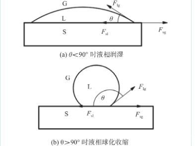 潤濕角θ的大小直接反映了液相對(duì)固體表面的潤濕程度,θ越小,潤濕性就越好。當(dāng)θ為0°時(shí),表示完全潤濕,小于時(shí)為潤濕狀態(tài),而大于時(shí)為不潤濕狀態(tài)。由于相同體積下,球形的表面積最小,表面張力驅(qū)使液體聚集到最小表面積狀態(tài),在釬料熔化后便聚合在一起收縮成球狀,從而發(fā)生液態(tài)釬料聚合現(xiàn)象。