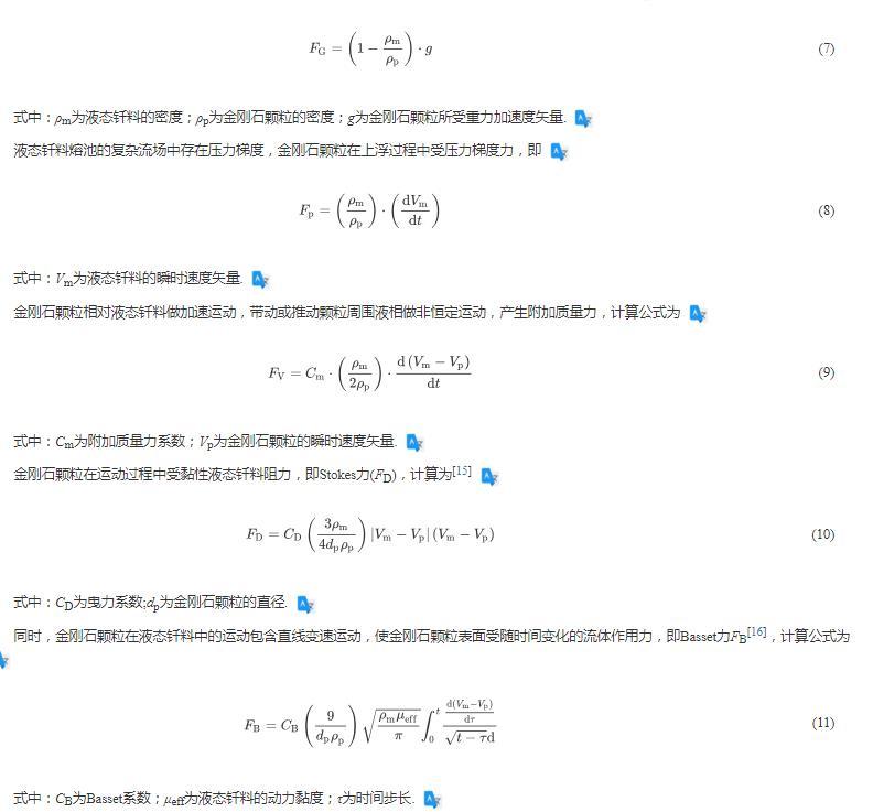 同時(shí),金剛石顆粒在液態(tài)釬料中的運(yùn)動(dòng)包含直線變速運(yùn)動(dòng),使金剛石顆粒表面受隨時(shí)間變化的流體作用力,即Basset力FB,計(jì)算公式為