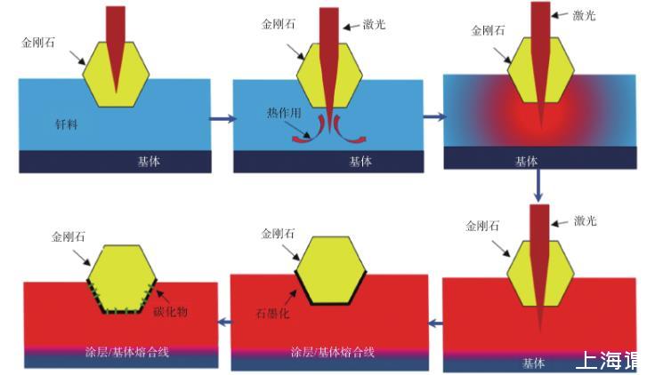 試驗(yàn)所用激光波長為1.075μm,因此在激光釬涂過程中,激光會(huì)透射金剛石而直接加熱釬料,釬料吸收激光能量而迅速升溫、熔化,形成熔池。熔池?zé)崃肯蚪饎偸瘋鲗?dǎo),潤濕金剛石,并誘導(dǎo)與熔池接觸的金剛石表面部分石墨化,與熔池中的Cr等元素發(fā)生反應(yīng),形成鉻的碳化物,增強(qiáng)了金剛石與釬料之間的冶金結(jié)合強(qiáng)度。釬料直接受熱升溫,金剛石被釬料熱傳導(dǎo)后吸熱升溫。金剛石透射激光的高效低損傷熱作用特性會(huì)有效避免金剛石在釬涂過程中的過熱損傷,這是激光釬涂金剛石涂層的最大潛在優(yōu)勢(shì)之所在,金剛石透射激光的熱作用如圖13所示。