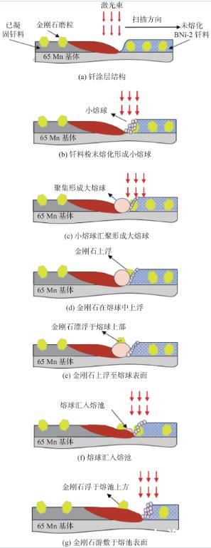 (2)金剛石釬涂層的成形歷經(jīng)粉末釬料熔化、液態(tài)釬料聚合、釬料微粉吸附熔合、釬料潤濕鋪展、金剛石遷移至涂層表層、涂層凝固成形6個(gè)階段,金剛石釬涂過程中,金剛石趨向于沿著熔體表面邊緣上浮,這主要是由于金剛石與液態(tài)釬料之間的界面張力遠(yuǎn)大于與固態(tài)基體界面張力所致。