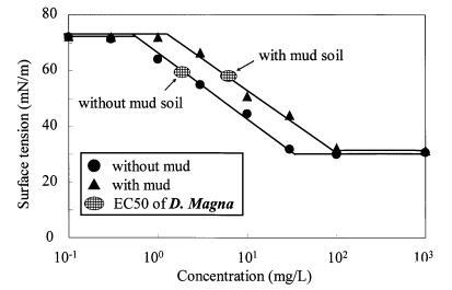 圖 11 泥土存在對地表的影響 LAS 和有毒表面張力的張力曲線 Daphnia Magna 的價值。