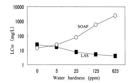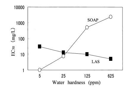 在預(yù)測試中,大型水蚤在 4 鹽混合中存活 溶液,但不能在 CaCl2?H2O 溶液中存活,也不能 蒸餾水。 另一方面,羅漢松在所有 3 種水中都能存活。 因此,羅漢果被用來 檢查水硬度成分對 LAS 和 SOAP 的毒性。 如圖 3 所示,CaCl2?H2O 之間沒有觀察到毒性值的差異 溶液和四鹽混合溶液。 肥皂的毒性 隨著水硬度的增加而降低,和 LAS的毒性隨著水硬度的增加而增加。