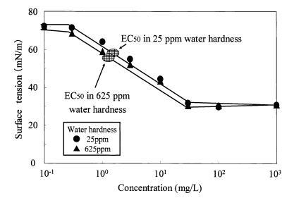 圖 10 水硬度對表面張力的影響 AE 和有毒表面張力值的曲線 水蚤麥格納。