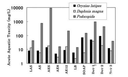 7 種表面活性劑和 3 種商品化劑的急性毒性 使用 3 種測試生物測量清潔劑: oryzias latipes、daphnia magna 和 podocipida。 結(jié)果 如圖 1 所示。在所有情況下,EC50 和/或 LC50 podocopida 高于 oryzias latipes 和 daphnia magna。 SOAP 和 LB 的毒性值 oryzias latipes 高于 daphnia magna, 而其他 5 種表面活性劑的毒性值 oryzias latipes 或 daphnia magna 幾乎相等。 這 表面活性劑可分為三類; 低毒 組(AES、SOAP 和 AE12),中毒性組(LAS 和 AS) 和高毒組 (AE8 和 LB)。