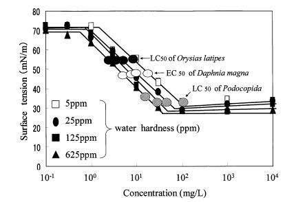 水的硬度與表面張力之間的關(guān)系, LAS 的水生毒性如圖 6 所示。 硬度增加,界面活性增加,臨界 膠束濃度 (cmc) 向左移動(即降低 濃度),gcmc 略有下降。 gtox 值是 繪制在表面張力曲線上。 gtox 值到oryzias latipes、daphnia magna 和 podocopida 分別約為 55 mN/m、45-50 mN/m 和 35 mN/m。