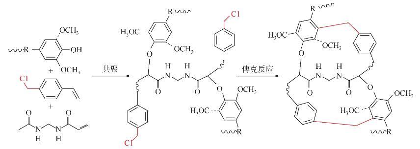 以上文獻(xiàn)表明木質(zhì)素基多孔聚合物作為吸附劑擁有巨大潛力,但目前報(bào)道的木質(zhì)素基聚合物的比表面積仍相對(duì)較小,且多為介孔大孔結(jié)構(gòu),雜原子含量不高,吸附性能仍有待提高。此外,將其應(yīng)用于放射性碘捕獲也很少有文獻(xiàn)報(bào)道?;诖耍疚臄M采用多步化學(xué)交聯(lián)策略,即先通過自由基共聚反應(yīng)接枝一定量的可烷基化或酰基化基團(tuán)的芳香族單體,且聚合中加入少量含雜原子的雙烯單體,使其得到理想的親疏水性以及充足的碘親和位點(diǎn)。接著,通過Friedel-Crafts反應(yīng)使上述內(nèi)親電試劑在木質(zhì)素共聚物的大分子鏈之間搭建大量由亞甲基等剛性基團(tuán)形成的交聯(lián)橋,原位構(gòu)筑剛性結(jié)構(gòu)支撐的雜原子修飾木質(zhì)素基超交聯(lián)聚合物,從而保證其對(duì)碘蒸氣或碘溶液具有快速的吸附速率、良好的穩(wěn)定性和高的吸附容量。