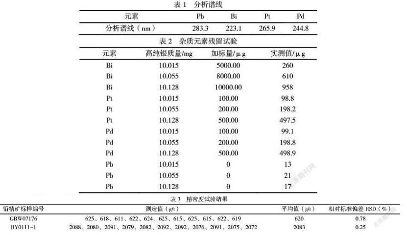 分別稱取3個(gè)10mg高純銀,向試金坩堝中加入不同質(zhì)量的鉍、鉑和鈀標(biāo)準(zhǔn)溶液,再按照試驗(yàn)方法進(jìn)行試驗(yàn),其結(jié)果見(jiàn)表2;在試驗(yàn)條件下,鉍元素隨著樣品中鉍量的增加,合粒中殘留的鉍也隨之增加;鉑、鈀可以在火試金實(shí)驗(yàn)過(guò)程中準(zhǔn)確測(cè)出,并且合粒中測(cè)出少量的鉛。