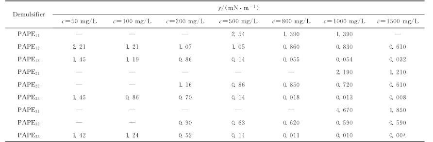 PAPE11、PAPE12和PAPE13是相對分子質(zhì)量相當、HLB值逐漸增大,亦即其親水性逐漸增強的3個破乳劑樣品。從表3還可以看出,在同樣的破乳劑濃度下,HLB值越大的破乳劑降低油-水界面張力的幅度越大,油-水界面張力越低,甚至發(fā)生數(shù)量級的變化;而要將油-水界面張力降低至同樣的水平,HLB值大的破乳劑所需要的濃度則更低,即其降低油-水界面張力的效率越高。PAPE21、PAPE22和PAPE23以及PAPE31、PAPE32和PAPE332個系列的破乳劑隨著HLB值的增大也表現(xiàn)出同樣的規(guī)律。PAPE12、PAPE22和PAPE32是保持HLB值相當、相對分子質(zhì)量逐漸增大的3個破乳劑樣品,隨著相對分子質(zhì)量的增大,它們降低油-水界面張力的能力均有所增強,但增強的幅度不大,大體均在同一數(shù)量級內(nèi)變化。PAPE13、PAPE23和PAPE33是水溶性最好的一組破乳劑,隨著相對分子質(zhì)量的增大,其降低油-水界面張力的能力也有所增強,但增強幅度仍然不大。由此可見,在所研究的破乳劑相對分子質(zhì)量變化范圍內(nèi),相對分子質(zhì)量變化對PAPEmn界面活性的影響較小。