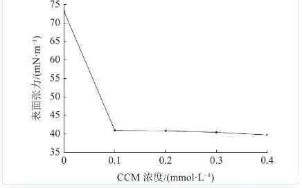 (2)CCM的加入可明顯降低水溶液的表面張力,當CCM濃度為0.1 mmol/L時,溶液表面張力為41 mN/m,繼續(xù)增大CCM濃度,溶液表面張力幾乎不變。因此,CCM的臨界膠束濃度約為0.1 mmol/L。
