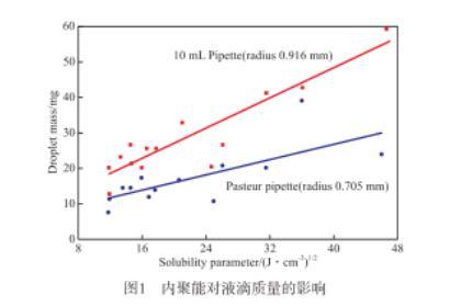 對于純物質的溶解度參數可通過文獻查閱、基團貢獻計算法和液體熱力學關系式計算。而礦物油為混合物,很難查到或者估算它的溶解度參數。文獻提供了一種溶解度參數的估算法:稱量10~20滴液體,然后計算每滴液體的平均質量;另取2種已知溶解度參數的非揮發(fā)性液體作為參照,通過做圖大致計算出液體的溶解度參數。實驗需保持恒溫。分別通過內徑為0.916 mm的10 mL移液管和內徑為0.705 mm的巴斯德移液管移取液滴,得到兩條溶解度參數與液滴質量的關系曲線。內聚能對液滴質量的影響見圖1。由圖1可見,液滴的質量與液體溶解度參數成線性關系。該估算方法可用來計算混合液體的溶解度參數,適用于礦物潤滑油溶解度參數的計算。雖然估算方法過于粗糙,但為估算礦物油等復雜混合物的溶解度參數提供了思路。文獻介紹了液滴的大小與液體表面張力有關。由此可見,溶解度參數與表面張力存在一定的關系。