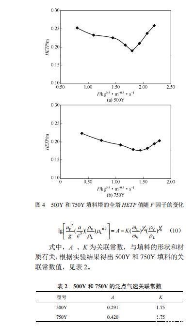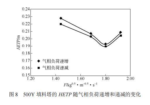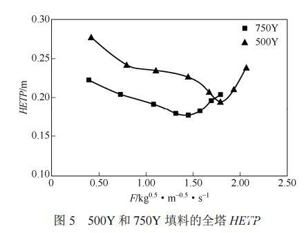 (1)在一定負荷范圍內(nèi),750Y填料的分離效率優(yōu)于500Y填料,但單位填料高度的壓降高于500Y填料,導致操作穩(wěn)定性比500Y填料差,處理量比500Y填料小。