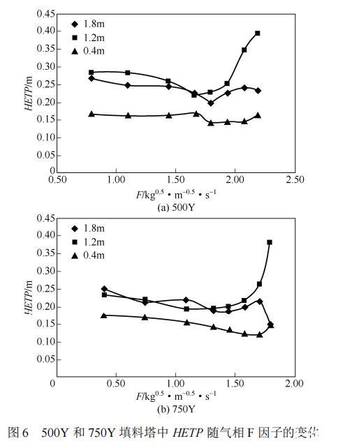 圖6為500Y和750Y填料塔中不同高度填料段HETP隨氣相F因子的變化。高度以填料層底部為基準。如圖6所示,填料段下部傳質(zhì)效率較高,上部傳質(zhì)效率下降。這是由于流體分布不均造成的。液相從頂端向下流動時,由于端效應,經(jīng)過一定高度填料層后液相才能鋪展開,接近均勻分布。而氣相因為受液相流動的影響,在填料塔下端氣相入口段分布比較均勻,在填料段頂端分布不均。從圖6還可以看出填料段中上部的傳質(zhì)效率波動較大,這是由于在此段填料內(nèi)流動狀況較為復雜,持液量和傳質(zhì)面積波動較大。Basden等指出持液量隨塔高并不是恒定的,在一定的氣液相流量下,Mellapak 500Y和MellapakPlus 752Y的持液量隨塔高的變化規(guī)律與本文中傳質(zhì)效率隨塔高的變化規(guī)律一致。