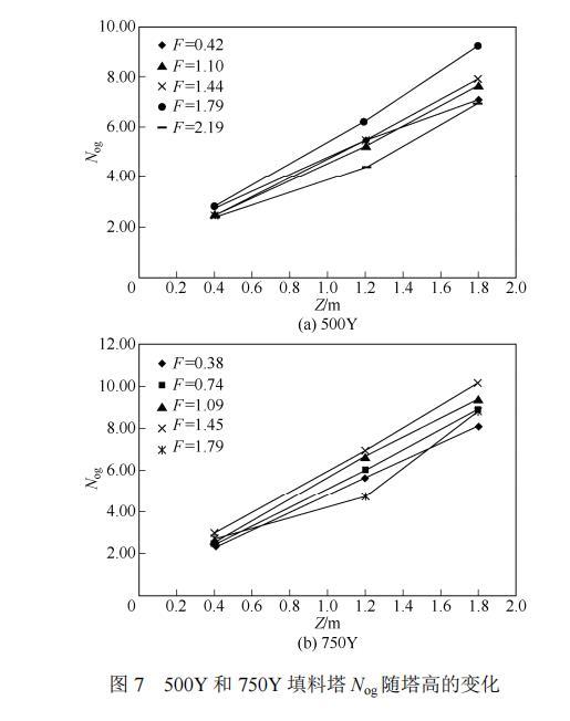圖7為500Y和750Y填料塔中Nog隨塔高的變化。由圖7(a)可以看出,大多數(shù)情況下500Y填料塔中Nog隨塔高的變化為一條直線,即總體積傳質(zhì)系數(shù)沿塔高不發(fā)生變化。這是因為在適宜的操作范圍內(nèi),塔內(nèi)流動狀態(tài)比較穩(wěn)定,氣相負荷一定時,氣相傳質(zhì)系數(shù)不變。正庚烷-甲基環(huán)己烷為純有機物系,表面張力中性體系,塔內(nèi)形成的微弱的正表面張力梯度有利于液膜的穩(wěn)定,從而使有效傳質(zhì)面積保持恒定。由此可以推測,對有機負體系而言,負的表面張力梯度會引起液膜沿流動方向不斷破碎,造成有效傳質(zhì)面積的減小,因此Kya隨塔高下降不斷降低。這與耿皎等[18]在直徑為30mm的玻璃精餾塔中選用正體系庚烷-甲苯和負體系苯-庚烷的精餾實驗得到的結論一致。從圖7(a)可得當氣相負荷過小或過大時,500Y填料塔中Nog隨塔高的變化并不是一條直線,這說明總體積傳質(zhì)系數(shù)Kya沿塔高發(fā)生變化。當氣相負荷很小時,總體積傳質(zhì)系數(shù)Kya沿氣相流動方向減小;當氣相負荷很大時,總體積傳質(zhì)系數(shù)Kya沿液相流動方向減小。當流體流量過高或過低時,塔內(nèi)流動狀態(tài)極不穩(wěn)定,過低的氣相負荷,使氣相傳質(zhì)系數(shù)沿氣相流動方向減小、氣液相接觸減弱,即表現(xiàn)為總體積傳質(zhì)系數(shù)Kya隨塔高增加而減?。欢^大的氣相負荷,引起液泛,液體積聚在塔上部很難流下,使沿液相流動方向液相傳質(zhì)系數(shù)減小、氣液相接觸減弱,即表現(xiàn)為總體積傳質(zhì)系數(shù)Kya隨塔高降低而減小。對比圖7(a)和7(b)可得,750Y填料塔中總體積傳質(zhì)系數(shù)Kya隨塔高的變化規(guī)律與500Y填料塔一致。