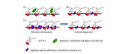 此外,活性分子稀疏地排列在界面上,如圖6(B)所示,并形成稀薄的混合吸附膜。因此,隨著時間的推移,吸附速率和脫附速率達到平衡,IFTs曲線也呈“L”形。在高濃度時,瀝青質(zhì)組分獲得了較高的能量,能夠突破油水界面能壘,因此這些組分能夠更快地擴散到界面,并與P-S14-4分子無序地排列在界面上。當這些亞組分與P-S14-4分子之間形成了最緊密的混合吸附膜時,明顯的協(xié)同作用產(chǎn)生,導致IFT達到最小值。