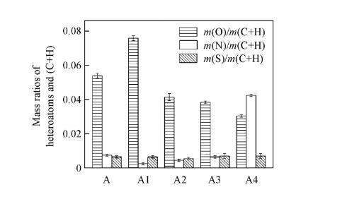 表1列出了瀝青質(zhì)及其亞組分的元素組成分析結(jié)果,其中,O的元素組成通過差減法獲得。由表1可知,這些組分主要由C和H元素組成,雜原子(O,N,S)含量較低,與文獻報道的瀝青質(zhì)元素分析結(jié)果一致。雜原子與碳原子和氫原子的質(zhì)量比m(O)/m(C+H),m(N)/m(C+H)和m(S)/m(C+H)值(見圖2),可以反映瀝青質(zhì)及其亞組分間雜原子比例的變化。比值越高,瀝青質(zhì)及其亞組分的極性越高。由圖2可知,在瀝青質(zhì)及其亞組分之間,m(O)/m(C+H)值變化明顯,其中,A1的m(O)/m(C+H)值最高,A和A2的m(O)/m(C+H)值高于A3和A4的;除A4的m(N)/m(C+H)值明顯較高外,其余m(N)/m(C+H)和m(S)/m(C+H)值變化均較小。由以上分析可知,A1的極性最高,而A3的極性最低。