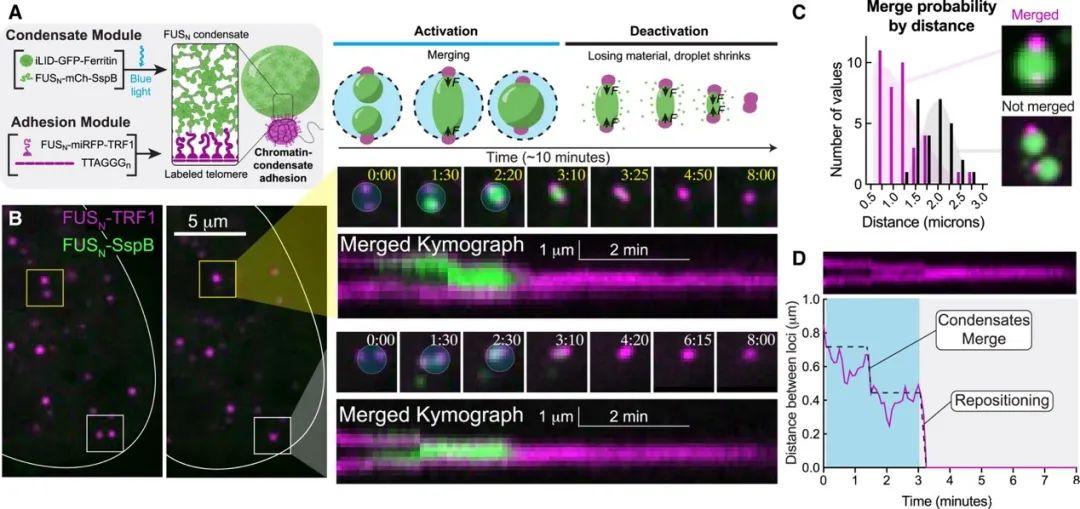 通過局部藍(lán)光激活,凝聚體可以在標(biāo)記的位點(diǎn)上被誘導(dǎo)形成。在持續(xù)光激活下,錨定到兩個相鄰染色質(zhì)位點(diǎn)的凝聚體會生長并融合為一個,并與目標(biāo)位點(diǎn)保持關(guān)聯(lián)。在去激活后,凝聚體收縮產(chǎn)生拉力,導(dǎo)致這些位點(diǎn)重新定位(圖1A)。這種方法能使端粒成功地在多個微米的核空間內(nèi)重新定位。然而,如果位點(diǎn)之間的距離超過2