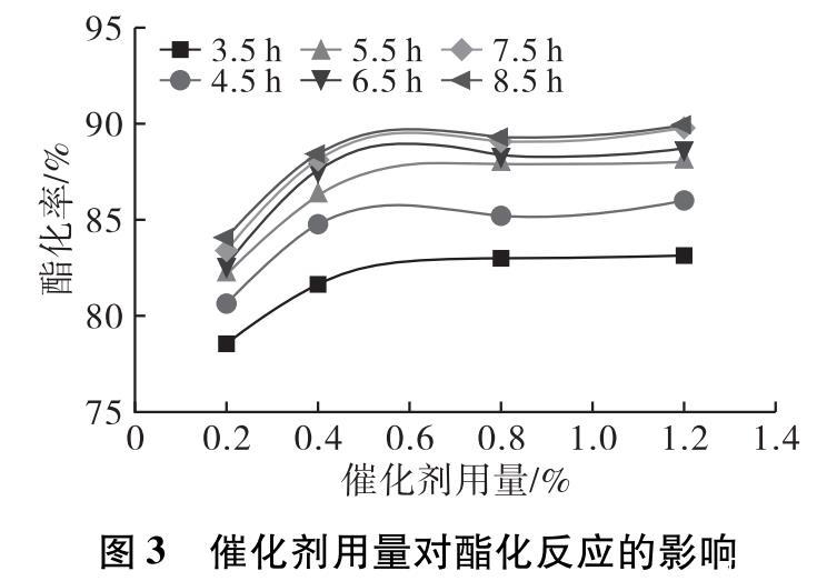 在投料比1∶1,預熱溫度80℃,預熱時間5 min,催化劑選擇4?型分子篩,反應溫度140℃,反應時間8.5 h,催化劑用量分別為0.2%、0.4%、0.8%、1.2%條件下進行酯化反應。反應3.5 h后每隔1 h取樣測試產(chǎn)物酸價,計算酯化率隨時間的變化,結果如圖3所示。
