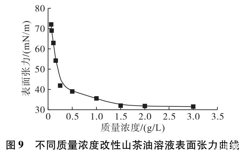 對不同質(zhì)量濃度的改性山茶油溶液進行表面張力測試,結果如圖9所示。