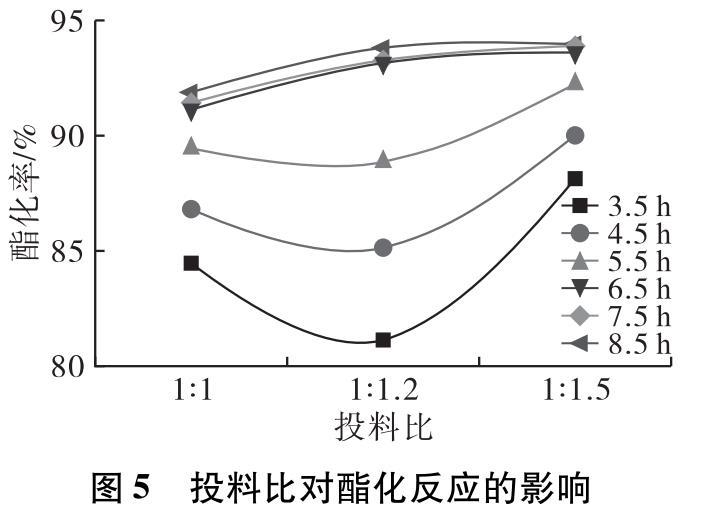 在投料比分別取1∶1、1∶1.2、1∶1.5,預熱溫度80℃,預熱時間5 min,0.4%的4?型分子篩催化劑,反應溫度180℃,反應時間8.5 h條件下進行酯化反應。反應3.5 h后每隔1 h取樣測試產(chǎn)物酸價,計算酯化率隨時間的變化,結果如圖5所示。