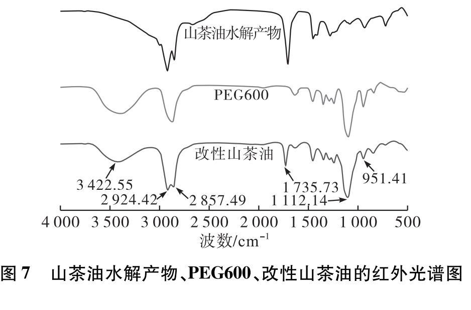 用50 mL的乙酸乙酯飽和食鹽水溶液分3次萃取產(chǎn)物,除去未完全反應的PEG600和山茶油水解產(chǎn)物,氮吹,干燥。對山茶油水解產(chǎn)物、PEG600和改性山茶油分別進行紅外性能表征,其紅外光譜圖如圖7所示。