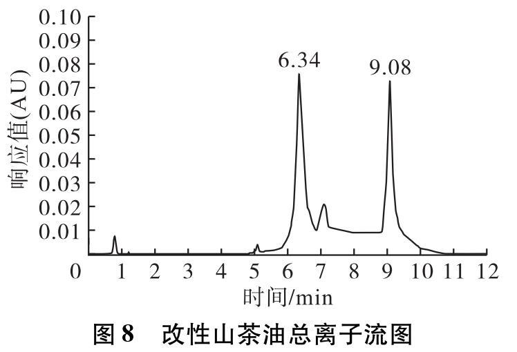 因為AccucoreTMC18色譜柱為非極性毛細管柱,非極性柱的保留作用主要是色散力造成的,其出峰順序一般符合沸點規(guī)律,沸點低的先出峰,沸點高的后出峰,所以PEG600單酯先出峰,PEG600雙酯后出峰。通過譜庫檢索發(fā)現(xiàn),6.34 min的峰主要是PEG600單酯,而9.08 min的峰主要是PEG600雙酯,這也說明PEG600和山茶油的水解產(chǎn)物發(fā)生了酯化反應且改性山茶油的主要成分是PEG600單、雙酯。