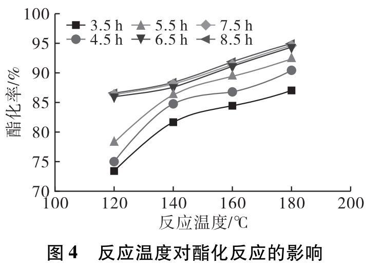 在投料比1∶1,預熱溫度80℃,預熱時間5 min,0.4%的4?型分子篩催化劑,分別設定反應溫度為120、140、160、180℃,反應時間8.5 h條件下進行酯化反應。反應3.5 h后每隔1 h取樣測試產(chǎn)物酸價,計算酯化率隨時間的變化,結果如圖4所示。