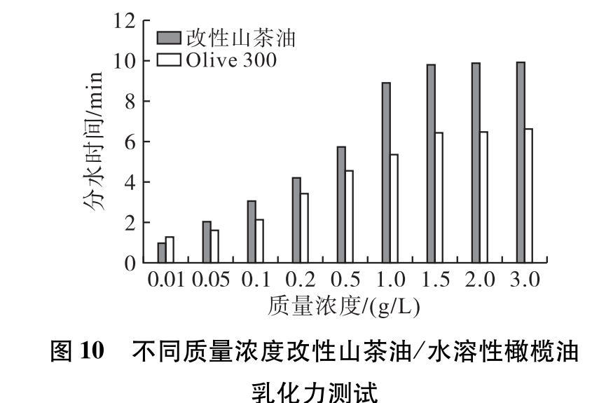采用分水法對不同質(zhì)量濃度的改性山茶油和水溶性橄欖油(Olive 300)進行乳化力測試,分水時間越長表明乳化性能越好,其結果如圖10所示。