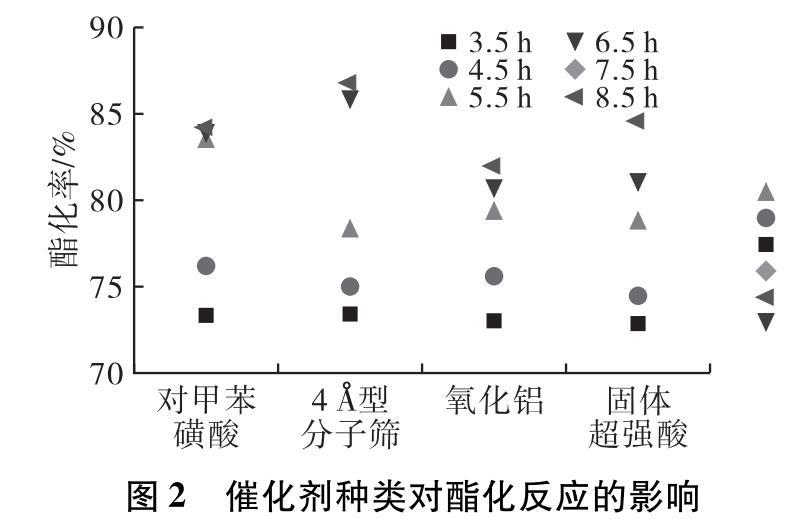 由圖2可知,在相同的工藝條件下4?型分子篩的催化效率高于其他催化劑。原因主要有兩點:首先,4?型分子篩復雜的孔道結構性相比其他催化劑增加了催化反應面積,并且具有較高的活性和穩(wěn)定性;其次,由于試驗過程沒有進行分水處理,導致反應產(chǎn)生的水滯留在體系中,體系達到平衡,而4?型分子篩具有一定的吸水作用,可以使平衡向正反應方向移動,提高了酯化率。而且在試驗后處理方面,4?型分子篩只需過濾處理,回收后還具有一定的催化活性,可以重復使用。綜合考慮,最終選擇4?型分子篩作為反應的催化劑。