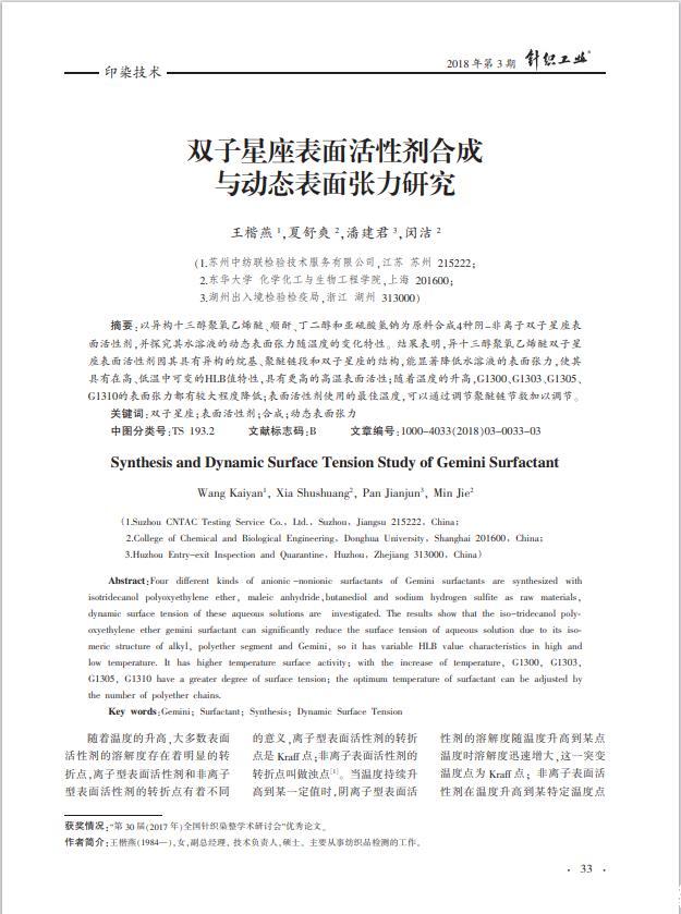 以異構(gòu)十三醇聚氧乙烯醚、順酐、丁二醇和亞硫酸氫鈉為原料合成4種陰-非離子雙子星座表面活性劑,并探究其水溶液的動(dòng)態(tài)表面張力隨溫度的變化特性。結(jié)果表明,異十三醇聚氧乙烯醚雙子星座表面活性劑因其具有異構(gòu)的烷基、聚醚鏈段和雙子星座的結(jié)構(gòu),能顯著降低水溶液的表面張力,使其具有在高、低溫中可變的HLB值特性,具有更高的高溫表面活性;隨著溫度的升高,G1300、G1303、G1305、G1310的表面張力都有較大程度降低;表面活性劑使用的最佳溫度,可以通過調(diào)節(jié)聚醚鏈節(jié)數(shù)加以調(diào)節(jié)。