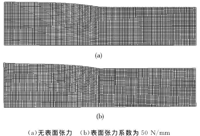 AE=1.2mm時(shí),表面張力系數(shù)為零和表面張力系數(shù)為50N/mm時(shí)的網(wǎng)格變形如圖4所示。從圖4可以看出,有表面張力和沒(méi)有表面張力的時(shí)候,網(wǎng)格的變形并沒(méi)有太大的區(qū)別,只是網(wǎng)格的變形量略微有些不同。說(shuō)明有表面張力的時(shí)候,自由表面的形變方式并沒(méi)有很大的變化。但在自由表面出口處的變形非常明顯。這說(shuō)明表面張力對(duì)微擠出自由表面出口處的流場(chǎng)影響很大。這是因?yàn)樽杂杀砻娉隹谔幍倪吔鐥l件突然變化,從而導(dǎo)致表面張力在此處的作用效果有較大變化。