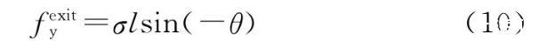 接觸角為零時(shí),表面張力系數(shù)值取0~50N/mm,計(jì)算得到的熔體自由表面出口處壓強(qiáng)與速度如圖9所示。圖9(a)中表面張力系數(shù)為零時(shí),自由表面出口處的壓力值接近零但并不等于零,是因?yàn)椴牧系酿ざ缺容^大,在自由表面出口附近流體之間產(chǎn)生的小的剪切作用使得流體在自由表面出口處的壓力值不為零。表面張力在自由表面流動(dòng)負(fù)方向的切向分力為: