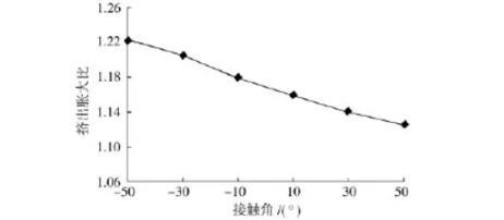 表面張力系數(shù)為50N/mm時(shí),接觸角取值:-50°~50°。數(shù)值模擬計(jì)算得到的擠出脹大比值如圖6所示。
