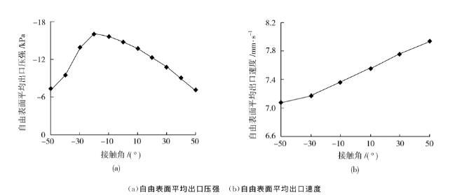 表面張力系數(shù)取50N/mm,接觸角取值為-50°~50°時(shí)得到的自由表面出口壓強(qiáng)與自由表面出口平均速度曲線如圖10所示。