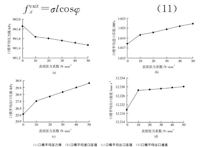 (2)在微擠出中,表面張力系數(shù)越大,擠出脹大越明顯,擠出口模內(nèi)熔體的進(jìn)出口壓強(qiáng)都明顯增大,口模內(nèi)熔體的壓力降略微減小,平均出口速度略微增大,自由表面出口壓力與平均出口速度都明顯減?。?
