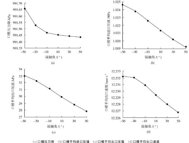 在表面張力系數(shù)為50N/mm不變時(shí),接觸角取值:-50°~50°。得到口模壓力降、口模平均進(jìn)出口壓力、以及口模出口平均速度曲線如圖8所示。由圖8可知,接觸角與口模流場(chǎng)參數(shù)的關(guān)系并不是線性關(guān)系。由圖6可知接觸角θ增大,自由表面擠出脹大比值減小,φ減小,表面張力對(duì)口模出口處的軸向分力如式(9)所示,牽引力隨著夾角φ值的減小而增大,使得材料在口模內(nèi)的剪切能量損失減小,因此壓力降減小。所以圖8(a)中口模平均進(jìn)出口壓力降減小。而圖8(b)、(c)中口模內(nèi)熔體進(jìn)出口壓強(qiáng)的減小是因?yàn)閿D出脹大減小,自由表面對(duì)外做功減小,自由表面對(duì)口模的阻力減小。圖8(d)中口模平均出口速度減小是因?yàn)楸砻鎻埩?duì)自由表面的徑向分力減小,口模內(nèi)熔體出口徑向速度減小,而熔體軸向速度不變,因此平均速度減小。