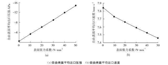 圖9表面張力系數(shù)對(duì)自由表面出口壓強(qiáng)與速度的影響
