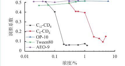 表面活性劑濃度是影響體系潤滑性能的重要原因之一。單一濃度無法全面系統(tǒng)地評價表面活性劑的潤滑性能,因此,進一步探究表面活性劑濃度對潤滑性能的影響,測定了不同濃度的5種表面活性劑在硅酸鈉水溶液中的潤滑系數(shù),如圖1所示。