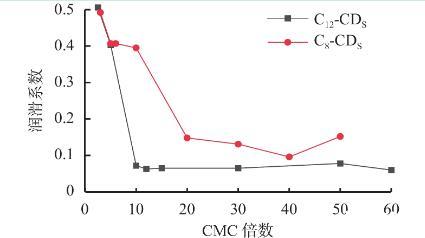 C12-CDS和C8-CDs的潤滑效果存在明顯差異,兩者疏水烷基鏈長度不同,而烷基鏈長度可影響表面活性劑的表界面活性以及膠束的形成,推測是CDs形成的膠束在潤滑過程中發(fā)揮作用,由此進一步探究CDs的膠束對潤滑性能的影響,圖2是CDs的硅酸鈉溶液潤滑系數(shù)與2種CDS各自的CMC倍數(shù)的關系曲線。