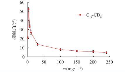 通過測(cè)試接觸角評(píng)價(jià)兩親性碳點(diǎn)的吸附性能,接觸角測(cè)定依據(jù)標(biāo)準(zhǔn)SY/T 5153—2017《油藏巖石潤(rùn)濕性測(cè)定方法》。具體實(shí)驗(yàn)步驟如下:將玻璃板浸泡在現(xiàn)配的食人魚溶液(濃硫酸∶雙氧水=3∶1)中1 min,進(jìn)行表面羥基化的親水處理,再洗凈烘干;將玻璃板下半部浸泡在表面活性劑溶液中,上半部懸空,讓溶液保持?jǐn)嚢锠顟B(tài),浸泡12 h后取出,自然晾干。利用光學(xué)接觸角測(cè)量?jī)x(DSA100,Krüss,德國)測(cè)定表面活性劑溶液浸泡前后水滴在玻璃板上的靜態(tài)接觸角。玻璃的主要成分為硅酸鹽,因此可用玻璃板模擬硅酸鹽顆粒表面。通過測(cè)定玻璃板水滴靜態(tài)接觸角研究C12-CDS潤(rùn)滑劑在玻璃表面的吸附性能,實(shí)驗(yàn)結(jié)果見圖3。