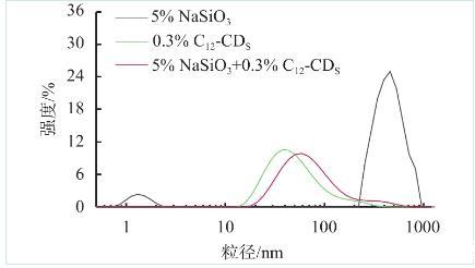 為進(jìn)一步明確兩親性碳點(diǎn)對(duì)硅酸鹽溶液的潤(rùn)滑機(jī)理,通過動(dòng)態(tài)光散射儀(Malvern Zetasizcrnano ZS90,Malvern,英國)測(cè)定硅酸鈉溶液、硅酸鈉與兩親碳點(diǎn)和硅酸鈉與聚氧乙烯型表面活性劑的混合溶液水動(dòng)力學(xué)直徑,其中散射角為173°,測(cè)試溫度為30℃。如圖6所示,質(zhì)量分?jǐn)?shù)為5%的Na2SiO3粒徑分布在220~800 nm之間,平均粒徑約為514.0 nm;質(zhì)量分?jǐn)?shù)為0.3%的C12-CDS溶液的粒徑主要分布在8~100 nm之間,平均粒徑為43.4 nm;而5%Na2SiO3+0.3%C12-CDS的混合溶液粒徑為10~120 nm,平均粒徑為63.2 nm,C12-CDS的加入使得Na2SiO3聚集體的尺寸大大降低,這表明C12-CDS可以讓Na2SiO3聚集體解聚,這與表面活性劑對(duì)膠體溶液的分散作用相關(guān)。由于大量C12-CDS分子或膠束吸附在Na2SiO3聚集體表面形成具有機(jī)械阻礙作用的水化膜,可對(duì)Na2SiO3聚集體起到穩(wěn)定分散作用。